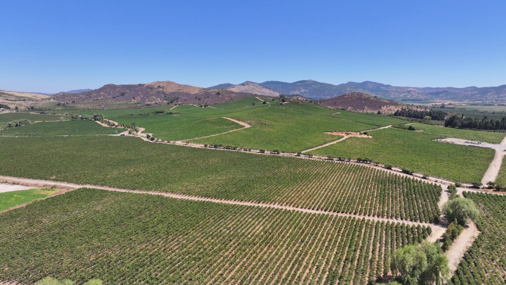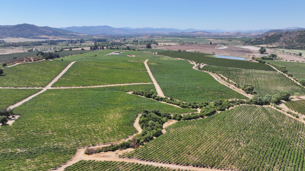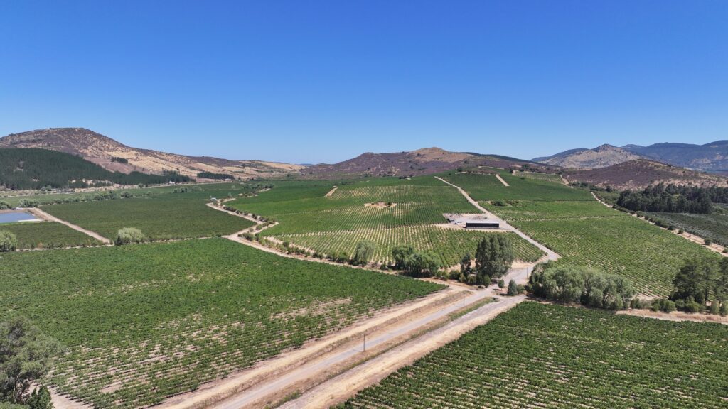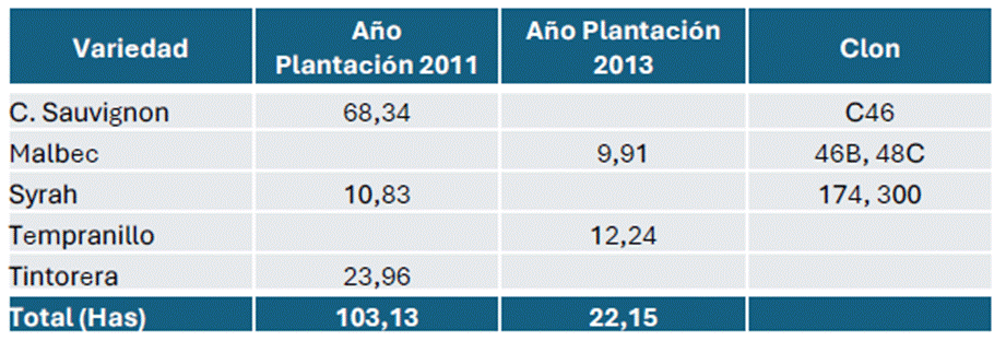 El viñedo fue establecido en dos etapas, los años 2011 (103 ha) y 2013 (22,15 ha), bajo un marco de plantación de 2,5 x 1,5 metros, lo que permite un manejo eficiente, buena densidad por hectárea y óptima mecanización. Actualmente se encuentra en plena etapa productiva, con huertos consolidados y estructura agronómica definida.